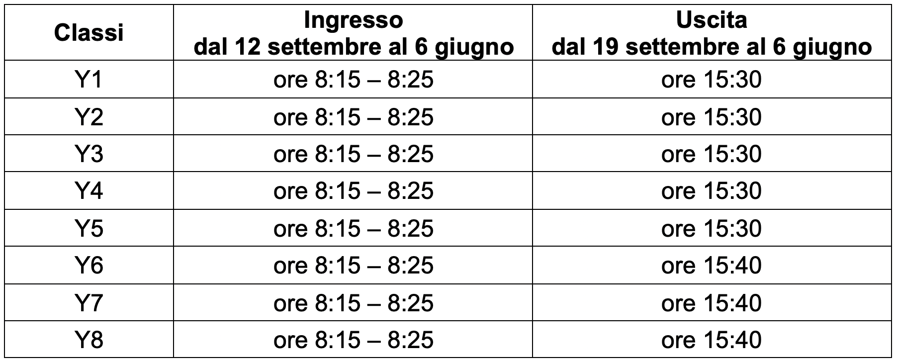 Tempo Pieno: dal 19 settembre: ingresso dalle ore 8:15 alle 8:55; uscita alle ore 15:40.