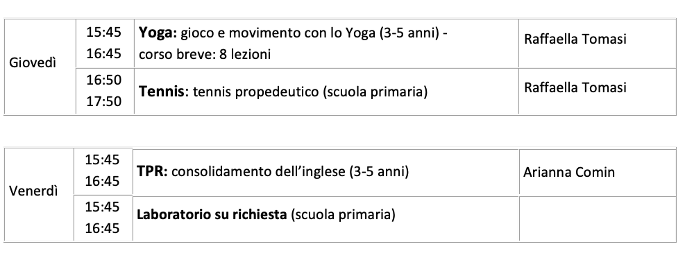 comunichiamo le attività extra scolastiche che proponiamo per i bambini della Scuola dell’Infanzia e della Scuola Primaria a partire dalle ore 15:45.